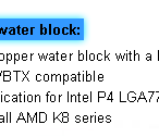 ‧All-in-one waterblock : For Intel BTX platform, P4 775 and AMD K8